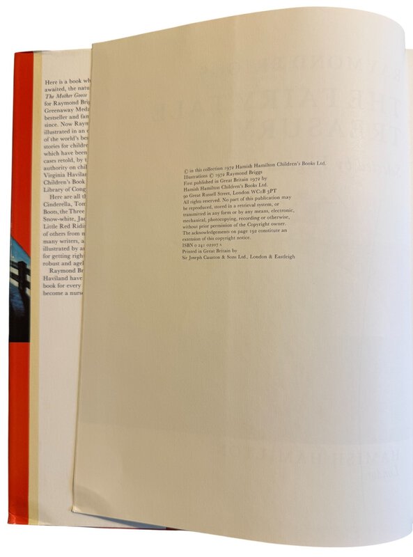 London: Hamish Hamilton, 1972. A beautiful copy of this first edition, lavishly illustrated by Raymond Briggs throughout. Clean and tidy dust wrapper over hardback with laminated boards. No chips or tears. There is a little bumping to the corners to the bottom of the book, but overall a near fine copy. Internally spotless throughout. 32 well know fairy tales re-told by Haviland. Every page features Briggs' disctinctive illustrations. 192 pages. 29.5cm x 22cm. Scarce in dust wrapper, particularly one this clean.