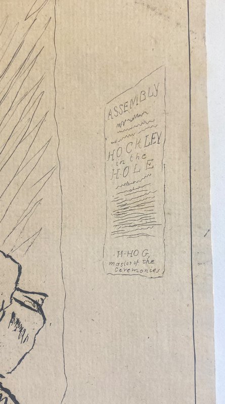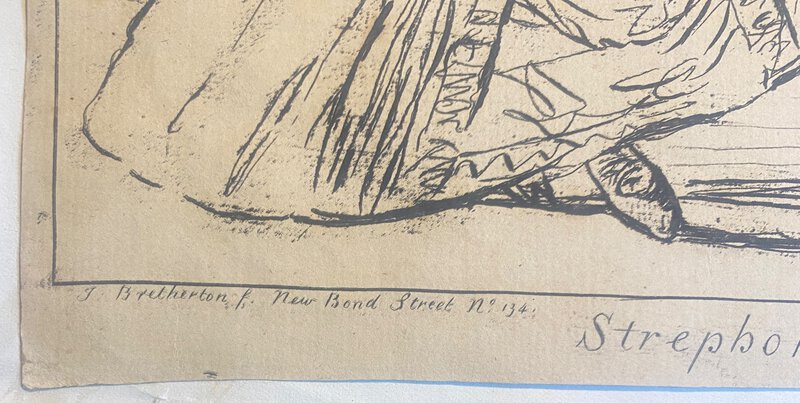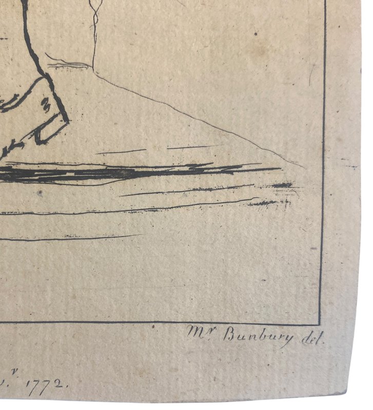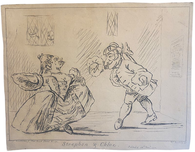 London: James Bretherton, 1772. First edition. Original engraving. tipped onto a white backing sheet. Satire on age and pretension referencing the Jonathan Swift poem: a caricatured elderly couple dancing together; behind two people laugh at them through a window; on the wall to right is a bill lettered, "Assembly / Hockley in the Hole / H Hog master of the ceremonies". 28 November 1772. Good condition. Clean and neat with very slight edgewear. 24cm x 30.5cm. Found in the British Museum Ref J,6.82: Their comments: "Strephon and Chloe was a scatalogical poem by Jonathan Swift, published in 1734. Hockley in the Hole was an unsalubrious area notorious for animal baiting. Stephens mistakenly describes the subject as a stage performance. According to Tim Clayton's unpublished catalogue of Bunbury's prints, the plate was sold by Bretherton 1799, second day, lot 151, 'Two, Strephon and Chloe and Robin Grey', and probably purchased by Fores who reissued it in 1801 (an impression in the Lewis Walpole Library)."