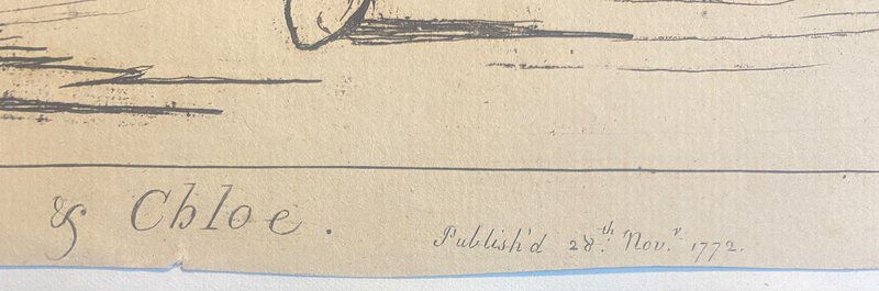 London: James Bretherton, 1772. First edition. Original engraving. tipped onto a white backing sheet. Satire on age and pretension referencing the Jonathan Swift poem: a caricatured elderly couple dancing together; behind two people laugh at them through a window; on the wall to right is a bill lettered, "Assembly / Hockley in the Hole / H Hog master of the ceremonies". 28 November 1772. Good condition. Clean and neat with very slight edgewear. 24cm x 30.5cm. Found in the British Museum Ref J,6.82: Their comments: "Strephon and Chloe was a scatalogical poem by Jonathan Swift, published in 1734. Hockley in the Hole was an unsalubrious area notorious for animal baiting. Stephens mistakenly describes the subject as a stage performance.…